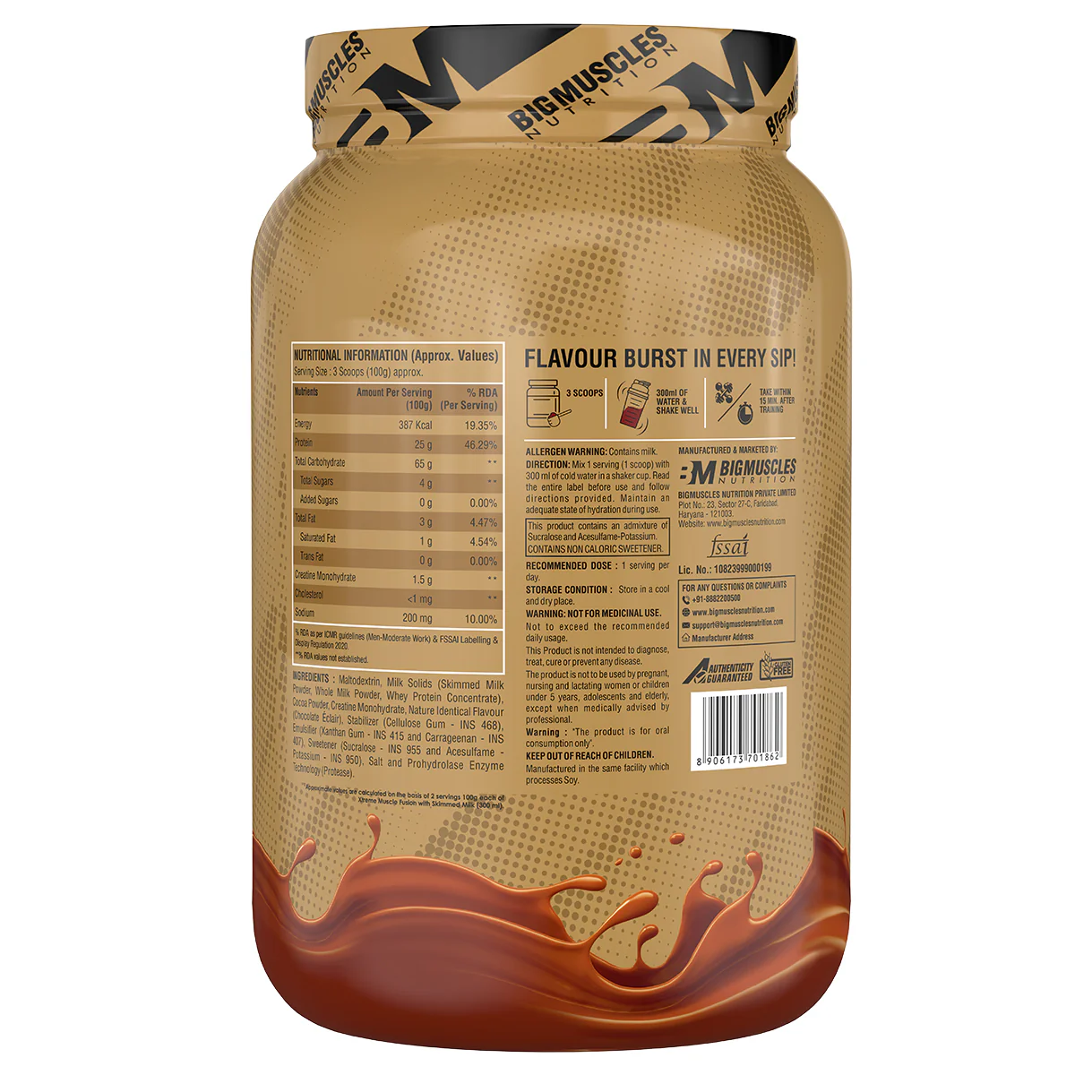 Soy Protein Isolate, Malt dextrin, Whole Milk Powder, Skimmed Milk Powder, Added flavours, Whey Protein Concentrate (80%), Starch, Sucrose, Whey Protein Isolate(90%), Creatine Monohydrate, Cocoa powder, Added Flavors (Nature Identical Flavoring Substances), Calcium Phosphate & Calcium Phosphate.